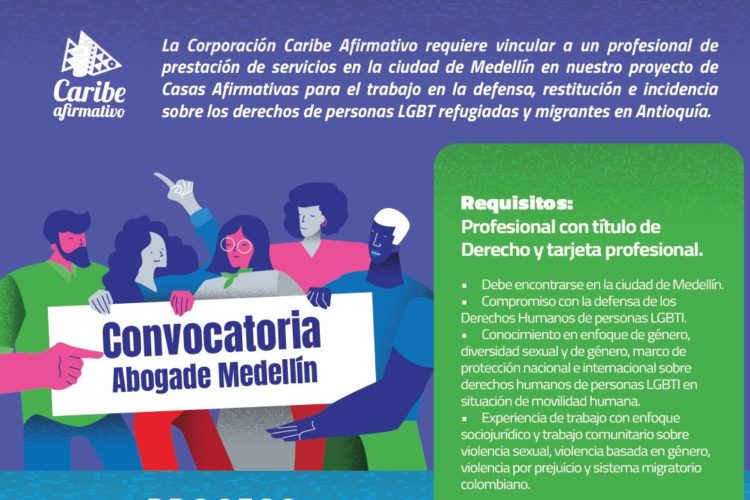 7 de abril de 2020. La Corporación Caribe Afirmativo requiere vincular a un profesional de prestación de servicios en la ciudad de Medellín en nuestro proyecto de Casas Afirmativas para el trabajo en la defensa, restitución e incidencia sobre los derechos de personas LGBT refugiadas y migrantes en Antioquía. Requisitos: Profesional con título de Derecho […]