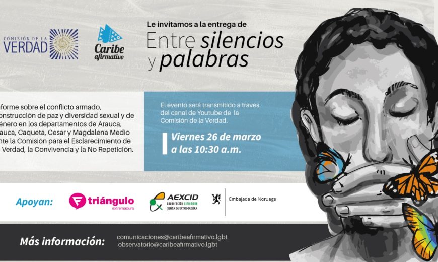 26 de marzo del 2021: Caribe Afirmativo presenta su cuarto informe ante la Comisión de la Verdad: “Entre silencios y palabras: conflicto armado, construcción de paz y diversidad sexual y de género en Colombia”, que es el resultado de un recorrido por los departamentos de Arauca; Caquetá, Cesar, Cauca y la subregión de Magdalena Medio, a través de las voces de las víctimas LGBT del conflicto armado. Este informe es presentado con el apoyo de la Fundación Triángulo de España, la Agencia Extremeña de Cooperación para el Desarrollo (AEXCID)y la Embajada de Noruega.