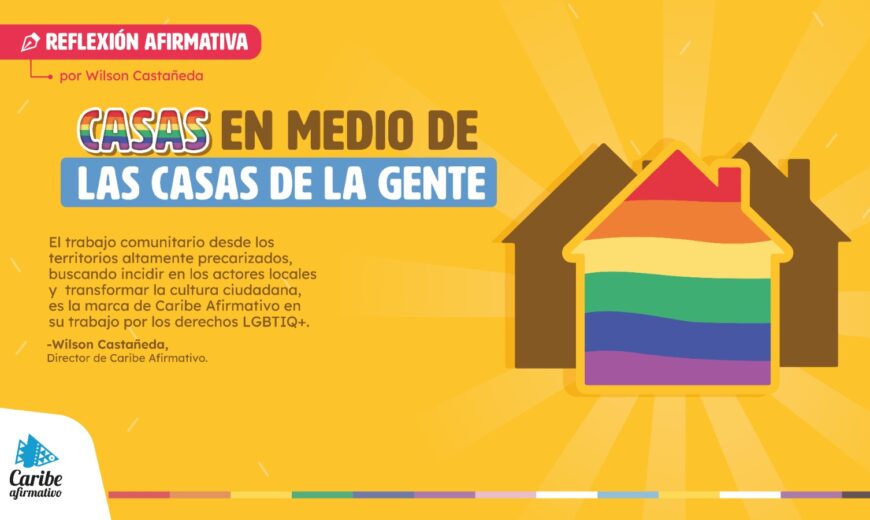 Hay dos palabras que, en su origen etimológico, son muy potentes y que, en su uso, necesariamente se refieren a grupo de personas y no a la individualidad; esta es la palabra “Casa”, del hebreo “Kisá”, que significa “cubrir a quienes están necesitando de protección y hogar”. La misma palabra en el latín “focaris” se expresa como “fuego, sentir calidez y experimentar seguridad con uno mismo”. Por ello, a la hora de abordar un proceso comunitario como estrategia para promover que las vidas puedan ser vividas —que es la tarea de Caribe Afirmativo— estos dos términos son necesarios, contundentes e interdependientes para cumplir el cometido. La casa, como expresión de refugio, acogida, descanso y lugar por excelencia, permiten pensar en términos intersubjetivos para desarrollar el proyecto de vida, es la esencia que ha permitido mutar del concepto material del lugar, a la comprensión integral de lo que este provoca: ser un hogar, donde se encuentra calidez y, en torno al bienestar colectivo, se juntan quienes tienen vínculos afectivos para sentir en su piel que su vida se dignifica y que se realiza su proyecto de ciudadanía plena.