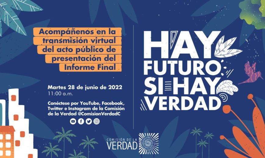 27 de junio de 2022. Mañana 28 de junio a las 11:00 am la Comisión de la Verdad presenta en el teatro Jorge Eliecer Gaitán el Informe Final al país. Este informe es el producto más importante del proceso de escucha, esclarecimiento y contrastación realizado, pues hace parte del legado que está institución deja a Colombia. El acto público será trasmitido por canales de televisión nacionales, plataformas digitales, tanto de la Comisión de la Verdad como de otras organizaciones y medios de comunicación.