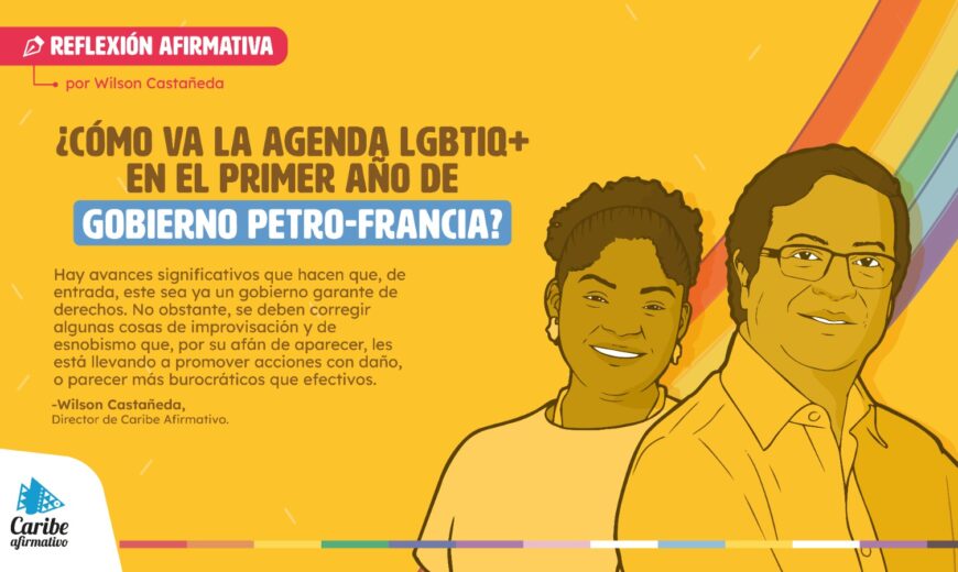 Al llegar al primer año del gobierno del Cambio que, entre otras cosas, asumió un compromiso directo con las personas LGBTIQ+ —en contravía del gobierno anterior, que obstaculizó los avances, compromisos y tareas pendientes— quiero hacer un balance de los avances en este año, los retos pendientes, así como los retrocesos, dificultades y desafíos, de cara a las elecciones territoriales. Del mismo modo mencionaré lo que, en este escenario, se debe avanzar para garantizar en los territorios, que es donde se denuncian las principales violencias, la vida digna de las personas sexo-género diversas.