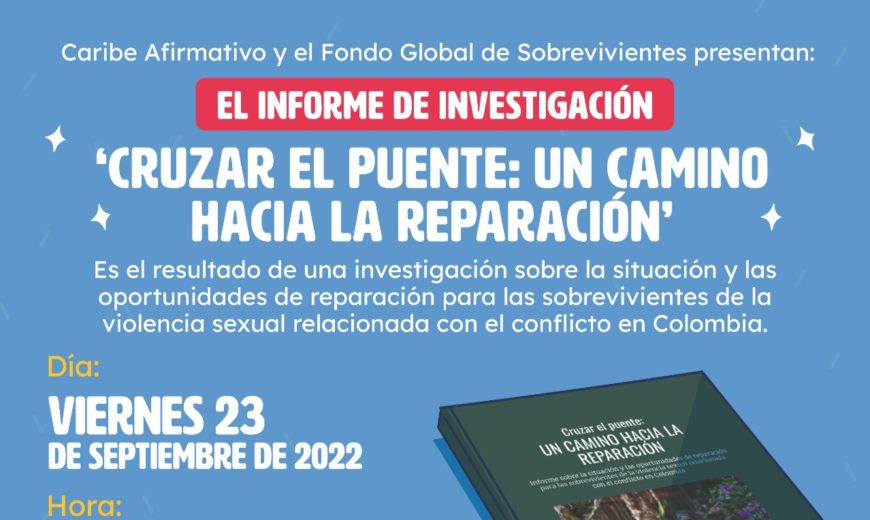 Caribe Afirmativo quiere invitarle a asistir a la presentación del informe de investigación Cruzar el puente: un camino hacia la reparación; el cual da cuenta de la situación y las oportunidades de reparación para las sobrevivientes de la violencia sexual relacionada con el conflicto en Colombia. La presentación se realizará el día 23 de septiembre de 2022 a las 9:00a.m. en el Aula Máxima del Paraninfo de la Universidad de Antioquia (CR. 44 # 48-72).