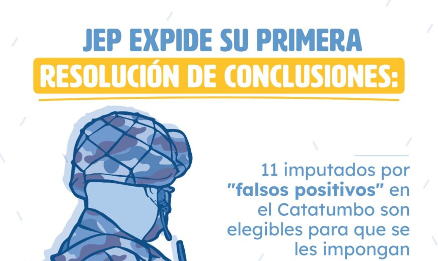 Octubre 21 de 2022. La Sala de Reconocimiento de Verdad, de Responsabilidad y de Determinación de Hechos y Conductas de la Jurisdicción Especial para la Paz (JEP) emitió su primera Resolución de Conclusiones. A través de esta decisión se destacan los reconocimientos y aportes suministrados por los comparecientes ante la JEP y se activa la competencia de la Sección de Primera Instancia para Casos de Reconocimiento de Verdad del Tribunal Especial para la Paz, órgano que deberá decidir sobre la imposición de las sanciones.