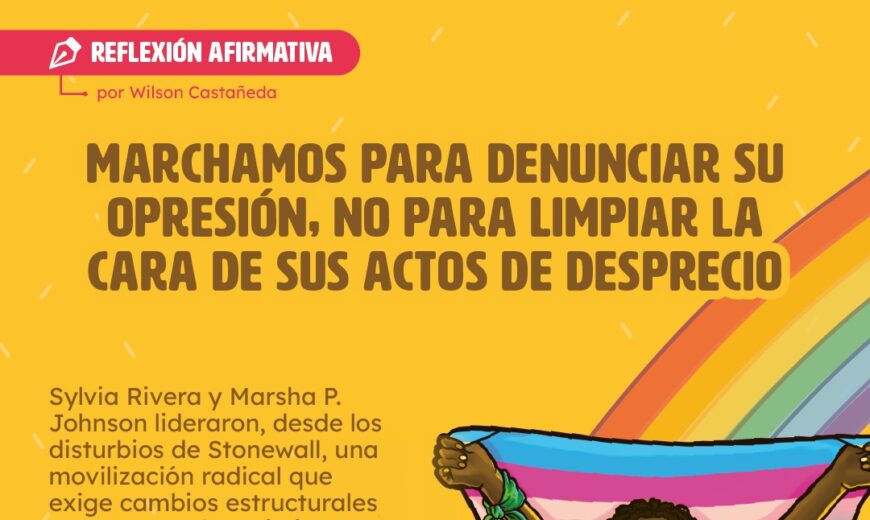 Parece que el ruido masculinizado del orgullo ha olvidado a sus protagonistas principales: mujeres trans latinas, negras, pobres y con convicción de cambio. Las efemérides arcoíris, para una generación que luchó a pulso por tener espacios de visibilidad, genera una sensación en doble vía: de un lado, como dice el Nobel, vivir para contarlo ante muchas que ya no están, y es que contar hoy más de 60 marchas en Colombia del orgullo, ver perfiles en redes sociales con mensajes de reconocimiento, edificios públicos engalanados con las banderas y acciones estatales dando respuesta a las demandas. Esto era lo que, en la década de los 80, era una utopía cuando, tímidamente, las primeras movilizaciones eran recibidas con indiferencia y violencia. No obstante, de otro lado, preocupa que, lejos de acogida con perspectiva de reparación que permita transitar de víctimas a ciudadanía con derechos y transformación de una sociedad patriarcal, misógina y prejuciosa, lo que está pasando es una acomodación del discurso de la “inclusión”, como práctica de fachada. Esta, particularmente, es liderada por los sectores capitalistas que usan la causa como un nicho de mercado; en este mes, te vende el plan turístico gay, la ropa con arcoíris, el souvenir de la marcha, pero no se contribuye a superar la pobreza, inequidad y falta de oportunidades que reclaman las personas LGBTIQ+ a gritos para poder llevar una vida digna.