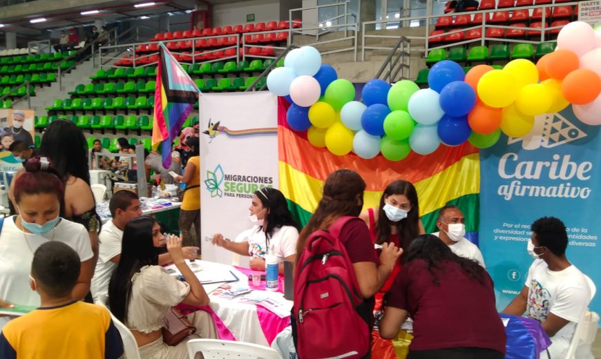 El recinto acogió a cientos de personas en proceso de movilidad humana, en una jornada exhaustiva que tuvo las puertas abiertas al público durante el viernes y sábado desde las 8 de la mañana hasta las 4 de la tarde sin interrupción alguna. Las personas que asistían al lugar recorrían una ruta de servicios; la primera era para retirar su Permiso por Protección Temporal ante el cuerpo de migración Colombia, en caso de que la persona no contara con un registro, las organizaciones presentes asistían en este proceso. Caribe Afirmativo tuvo la importante tarea de orientar, asesorar y acompañar a las personas LGBTI+ durante esta jornada realizada en el “Sugar Baby Rojas Coliseo” de la mano de organizaciones de base comunitaria, cooperación internacional y funcionariado público.