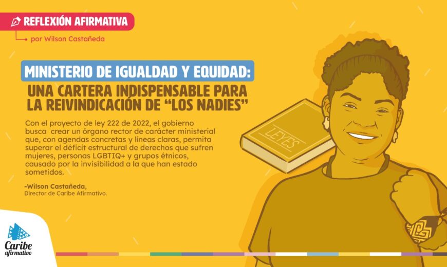 El pasado martes 18 de octubre, la vicepresidenta de Colombia, Francia Márquez, rodeada de algunas personas de grupos poblacionales históricamente excluidos y discriminados –que éste Estado patriarcal ha condenado como “los nadie”– presentó ante el congreso el proyecto de ley que busca crear en el país el Ministerio de Igualdad y Equidad, cartera que pretende ser la infraestructura gubernamental desde donde se articulen todas las acciones del Plan de Desarrollo Nacional (PND) tendientes a garantizar el acceso a derechos y garantías de ciudadanía plena a las mujeres, personas afro, indígenas, LGBTIQ+, habitantes de calle, personas con discapacidad, campesinas, niños, niñas, adolescentes, jóvenes, adultos mayores y personas empobrecidas, buscando hacer realidad aquella potente declaración de Márquez el pasado 7 de agosto cuando juró la vicepresidencia “(…)Hasta que la dignidad sea costumbre”.