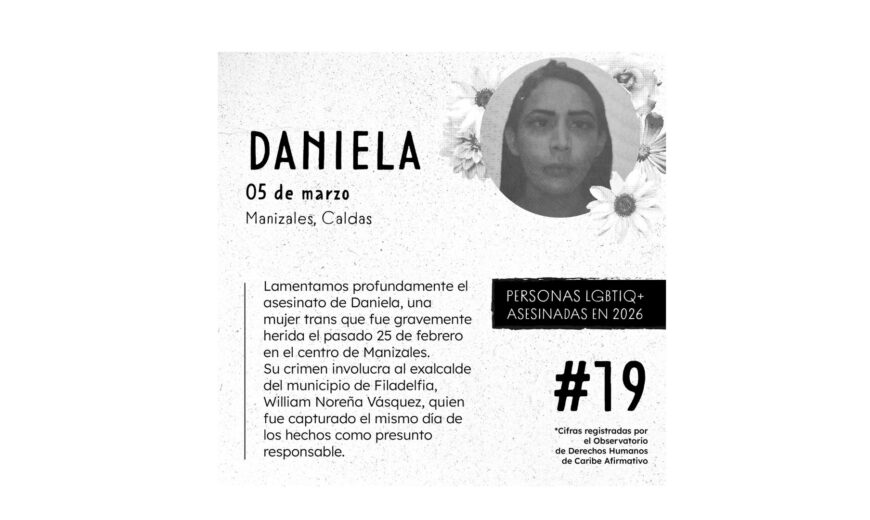 5 de marzo de 2026. La mañana de este jueves se confirmó la muerte de Daniela, mujer trans que había resultado gravemente herida tras un ataque con arma de fuego ocurrido el pasado 25 de febrero en el centro de Manizales. El presunto responsable es el exalcalde del municipio de Filadelfia, William Jairo Noreña Vásquez, quien fue capturado el mismo día de los hechos.