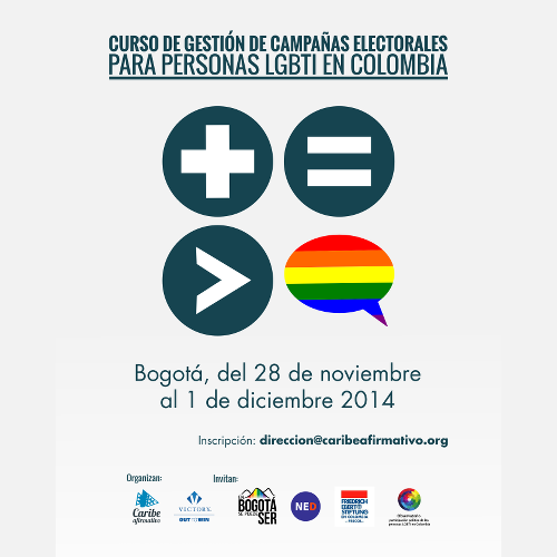 La corporación Caribe Afirmativo, el Gay & Lesbian Victory Institute, en el marco del observatorio de la Participación Política de las personas LGBTI, y junto a la Alcaldía Distrital de Bogotá, convocan el Curso de Gestión de Campañas Electorales para personas LGBTI en Colombia, que se celebrará en Bogotá del 28 de Noviembre al 1 de Diciembre. El curso está específicamente destinado a jóvenes de la ciudad de Bogotá. El curso contará con 25 plazas, reservándose algunos cupos para personas de diferente edad y de fuera de Bogotá.