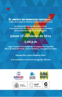 La Corporación Caribe Afirmativo, como ya es habitual, en el séptimo aniversario de la muerte de nuestro inspirador Rolando Pérez Pérez, hombre gay asesinado el 23 de febrero de 2007 en Cartagena –hecho que sigue en la impunidad-, presenta su informe sobre la situación de derechos de lesbianas, gays, bisexuales y trans (LGBT) en el Caribe Colombiano durante 2013, realizado con el apoyo del programa de derechos humanos de USAID.