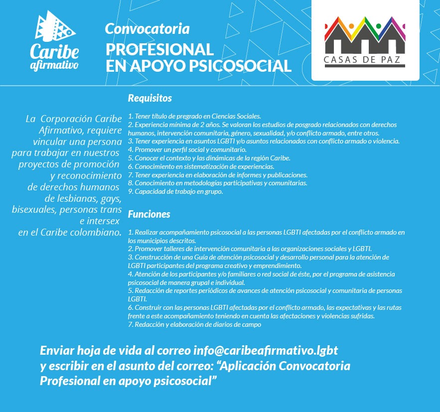 La Corporación Caribe Afirmativo requiere un profesional en apoyo psicosocial para trabajar en proyectos de promoción y reconocimiento de los derechos de las personas lesbianas, gais, bisexuales, trans e intersex del Caribe colombiano. Hasta el 25 de enero hay plazo de enviar hojas de vida al correo info@caribeafirmativo.lgbt. ¡Participa!