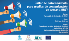 Este 20 de noviembre de 2015, se llevará a cabo el Taller de Entrenamiento para Medios de Comunicación en temas LGBTI, en el consultorio jurídico de la Universidad Autónoma del Caribe (Calle 88 No. 47 – 54) de 9:00 am – 1:00 pm. Los temas a tratar serán: estereotipo negativo y su impacto sobre la […]
